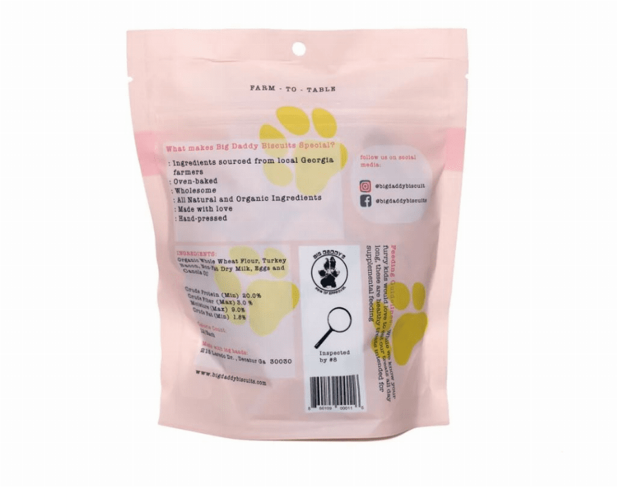 Let's face it: your dog loves bacon as much as you do. You'll never have to sneak your pup snacks under the table again with our all-natural turkey bacon dog biscuits. Our bacon biscuits are made with certified organic whole wheat flour, all-natural turkey bacon, and local eggs straight from the farm. Try this all-natural, healthy alternative to letting your dog eat people food! 8 oz