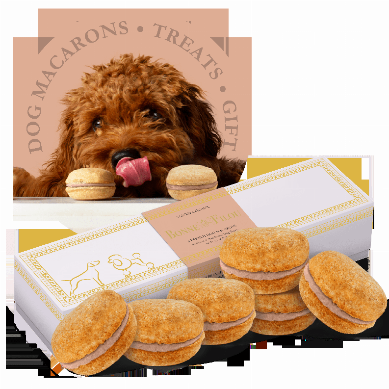 2 Reward your classy canine with a fancy treat by feeding her these Bonne et Filou Handmade Human-Grade Macaron Dog Treats. These wag-worthy rewards are made in the USA with all-natural ingredients. They have a hard exterior and are filled with an irresistible yogurt filling, for a texture combination that your canine is sure to love! And you ll be happy to know that they are 100% free from corn, wheat, preservatives and anything artificial, including colors. These yummy macarons are human grade and endorsed by veterinarians, too. Serve your pup a treat and say bon appetit!