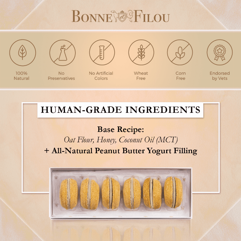 2 Reward your classy canine with a fancy treat by feeding her these Bonne et Filou Handmade Human-Grade Macaron Dog Treats. These wag-worthy rewards are made in the USA with all-natural ingredients. They have a hard exterior and are filled with an irresistible yogurt filling, for a texture combination that your canine is sure to love! And you ll be happy to know that they are 100% free from corn, wheat, preservatives and anything artificial, including colors. These yummy macarons are human grade and endorsed by veterinarians, too. Serve your pup a treat and say bon appetit!
