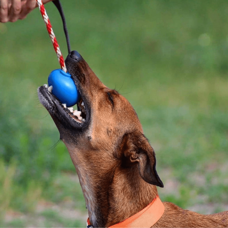 The Cherry Bomb Toy will have your dog bursting with excitement. It's is a chew toy, a treat dispenser, a tug toy and a retrieving toy all in one!