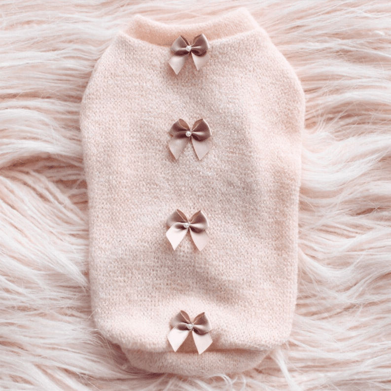 Hello Doggies, Dainty Bow Sweater Collection is featured in two different colors Pewter, and Peach. Both sweaters are made from light, soft wool fabric. The Pewter sweater is adorned with satin bows and the peach with satin bows adorned with a pearl. Our sweater collection is sure to keep your baby stylish and warm. Hand wash, and air dry.