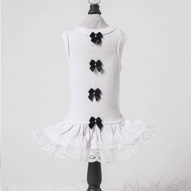 Hello Doggies, Sweetheart Dress Collection is 100% cotton, trimmed with ruffled lace, and features satin bows adorned with pearls. Our dress collection has three color option bows to select from. Wash on gentle, no bleach, no fabric softener, and dry on low heat.