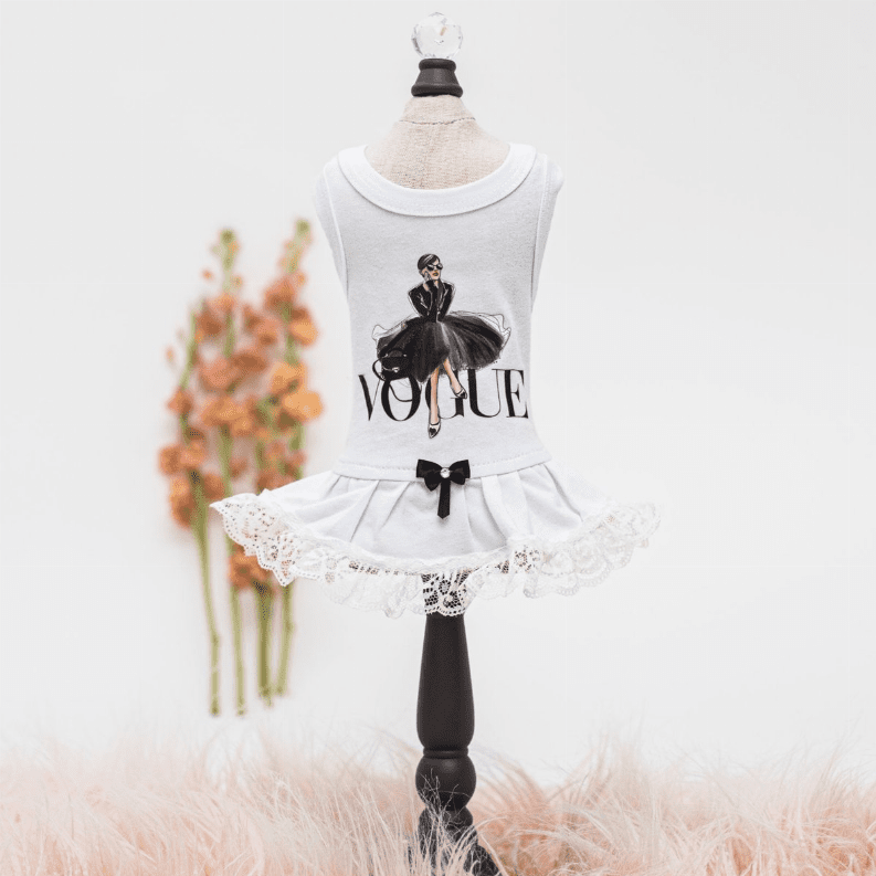 Have your baby feeling like a star with our glamourous Vogue dog dress created by Hello Doggie. Featuring a satin handmade bow adorned with a swarovski crystal. The dress also has a delicate lace trim for that final finishing touch.