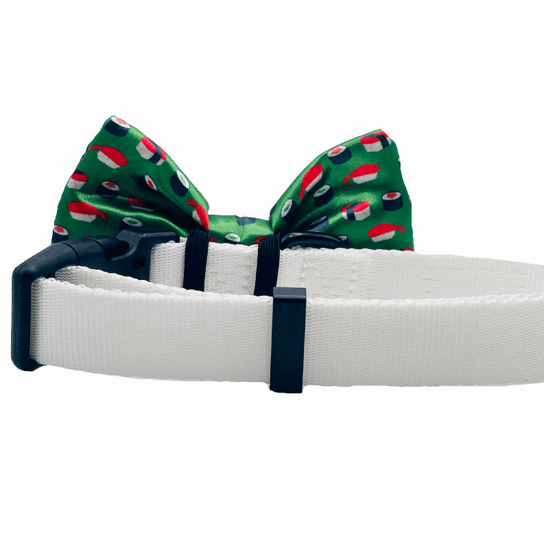 Our bow ties are made with high-quality fabric and thickly sewn; contributing to its durability. All bow ties are 2" x 4" and fastens securely over any dog collar easily with the two elastic loops on the back of the bow tie - as seen in pictures. Collar not included.