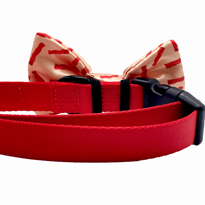 Our bow ties are made with high-quality fabric and thickly sewn; contributing to its durability. All bow ties are 2" x 4" and fastens securely over any dog collar easily with the two elastic loops on the back of the bow tie - as seen in pictures. Collar not included.