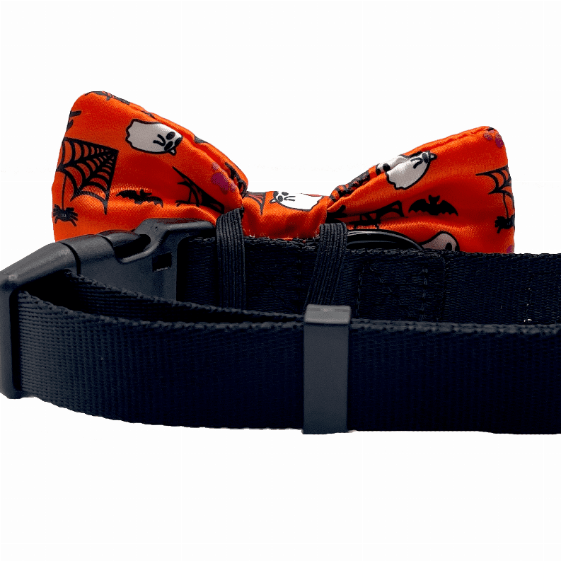 Our bow ties are made with high-quality fabric and thickly sewn; contributing to its durability. All bow ties are 2" x 4" and fastens securely over any dog collar easily with the two elastic loops on the back of the bow tie - as seen in pictures. Collar not included.
