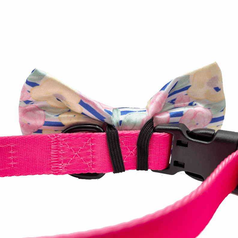 Our bow ties are made with high-quality fabric and thickly sewn; contributing to its durability. All bow ties are 2" x 4" and fastens securely over any dog collar easily with the two elastic loops on the back of the bow tie - as seen in pictures. Collar not included.