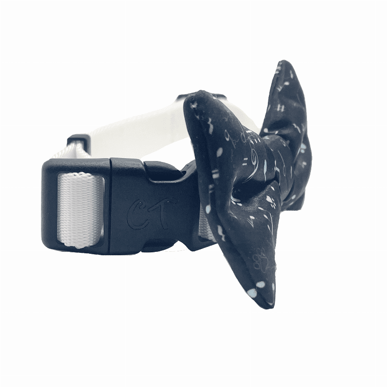 Our bow ties are made with high-quality fabric and thickly sewn; contributing to its durability. All bow ties are 2" x 4" and fastens securely over any dog collar easily with the two elastic loops on the back of the bow tie - as seen in pictures. Collar not included.