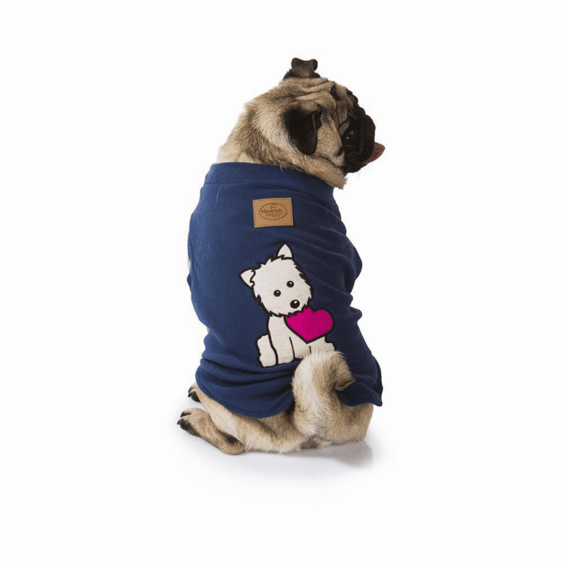 These soft blue fleece dog pyjamas with a puppy heart dog motif are the best dog clothes to keep your boy pooch snugly and warm.